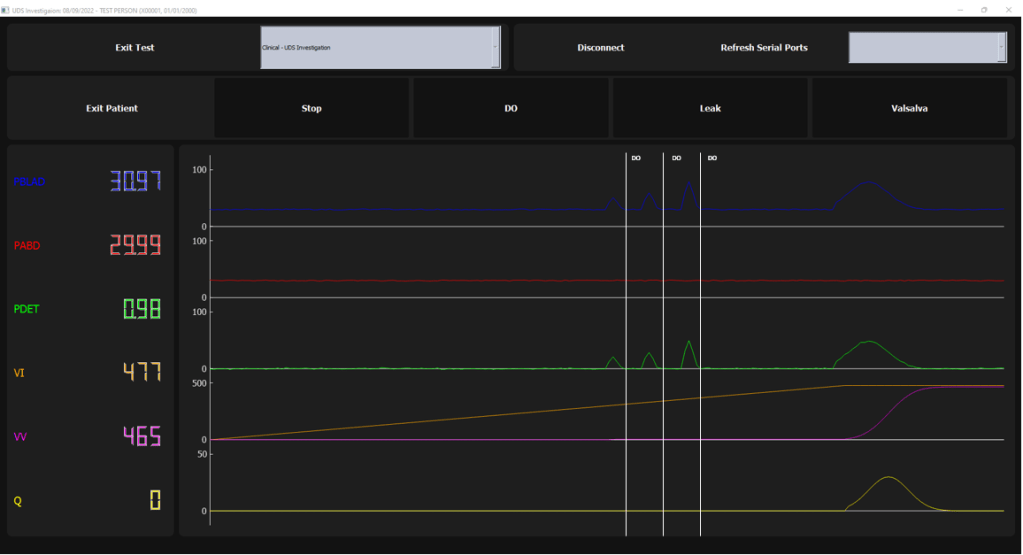 The image below displays the software used for recording, analysis, and reporting UDS investigations. The software can also be used to assess the system’s hardware performance (Uroflowmetry assessment, Pressure channel Assessment, and Fluid infusion assessment).